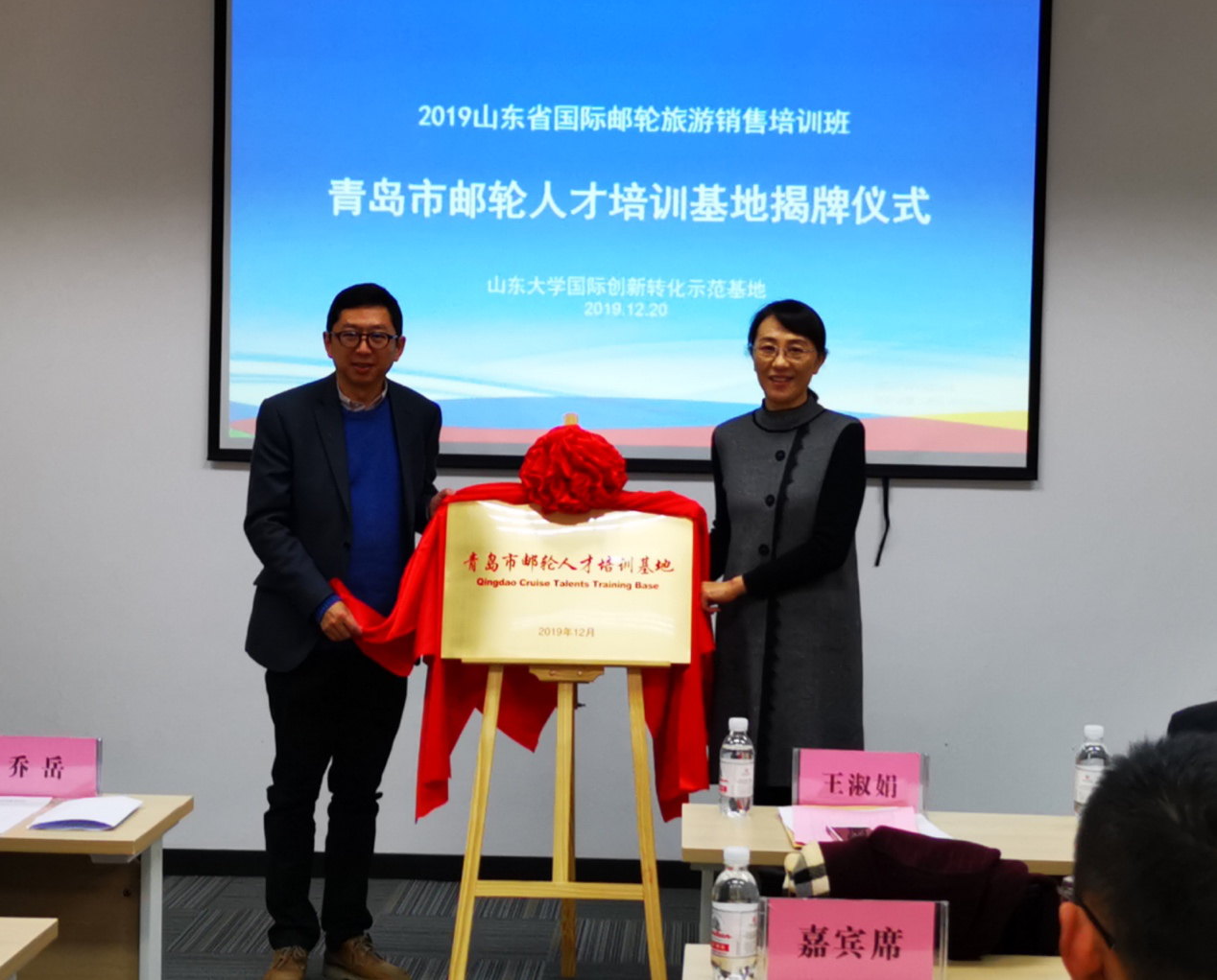2019年12月20日下午,青岛市邮轮人才培训基地揭牌仪式在山东大学国际创新转化示范基地(以下简称基地)教室4举行,出席揭牌仪式的嘉宾有taptap点点体育副院长乔岳、办公室主任以及EDP中心主任郑海涛,青岛市文化和旅游局副巡视员王淑娟,青岛市市北区文化和旅游局副局长张娜,朝中航运有限公司负责人胡寅清等人。基地相关工作人员参加本次活动。