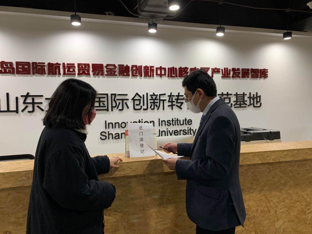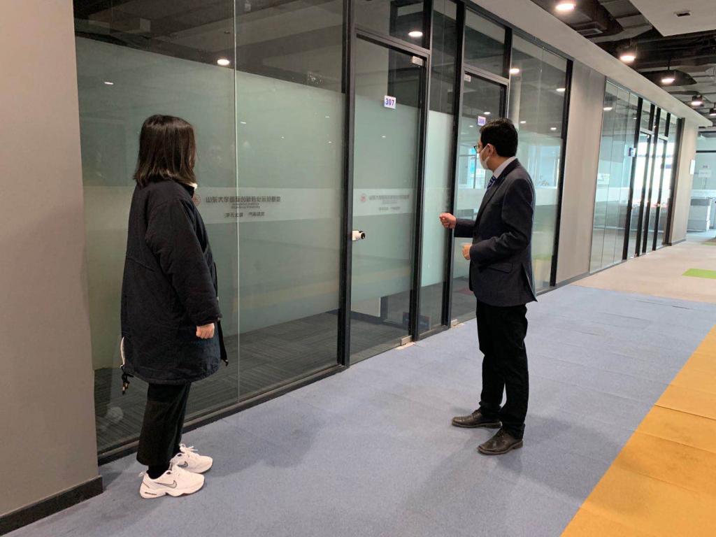 3月20日下午,taptap点点体育副院长乔岳来到山东大学国际创新转化示范基地(下简称基地)检查防疫和企业复工情况。