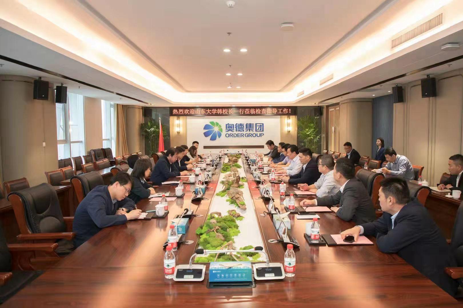 19日,韩建新、王飞一行在河东区人民政府副区长徐彬的陪同下参访奥德集团,奥德集团董事局主席林凡连、集团常务副总裁刘建波等出席座谈会。林凡连对山东大学代表团一行的到来表示欢迎,他谈到,山东大学是培养人才的摇篮,企业发展需要各方面的人才,奥德的发展离不开山东大学等国内一流高校的支持。他表示,奥德将为大学生提供更多创业及实践机会,希望双方在人才引进、创新创业平台建设、产业转型升级等层面加强合作,打造校企“联姻”的新高地。韩建新表示,高校和企业深入合作是山东大学“服务山东”理念的具体体现,山东大学与奥德集团要在人才培养、合作研究、创新创业等方面建立长期战略合作关系。王飞谈到,山东大学将充分发挥学科优势,积极对接企业发展需求,充分挖掘优势资源,进行案例研究,探索充满前景和希望的校企合作之路,助力塑造中国优秀企业典范,形成可复制可推广的合作经验,更好服务山东的经济发展。