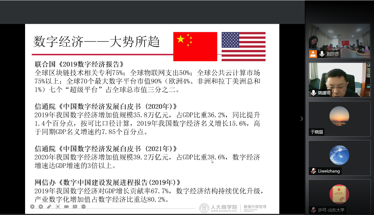 2021年9月17日下午,学院首次专家学者学术讲座,邀请到中国人民大学教授、博士生导师姚建明,线上为学院全体教师做题为“数字经济与管理创新”的学术讲座。学院全体教师通过线上、线下结合形式参加讲座并进行交流。