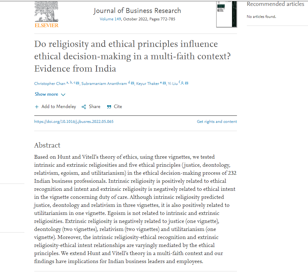 2022年6月,我院刘怡副教授作为通讯作者的学术论文《Do religiosity and ethical principles influence ethical decision-making in a multi-faith context? Evidence from India》,在商学领域国际重要期刊《Journal of Business Research》2022年第149卷发表。