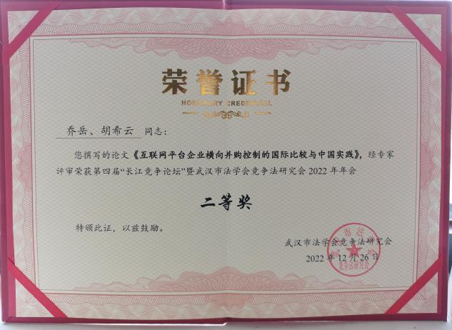 我院乔岳教授与政治学与公共管理学院硕士研究生胡希云参加第四届“长江竞争论坛”暨武汉市法学会竞争法研究会2022年年会,其合作撰写的论文,“互联网平台企业横向并购控制的国际比较与中国实践”,经专家评审荣获本届论坛论文二等奖。
