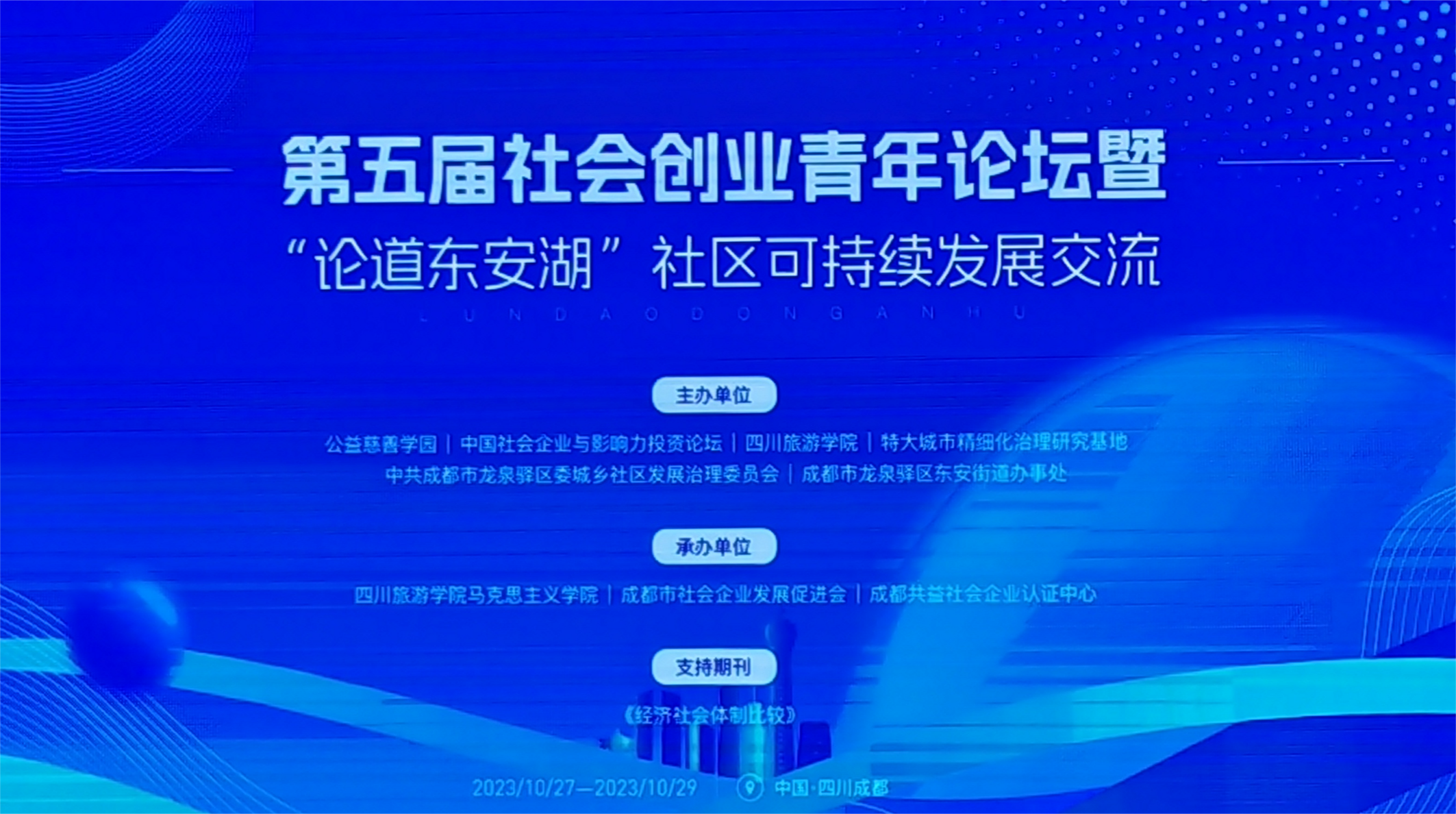 10月28日,由公益慈善学园、中国社会企业与影响力投资论坛、四川旅游学院等主办,四川旅游学院马克思主义学院、成都市社会企业发展促进会、成都共益社会企业认证中心承办的第五届社会创业青年论坛(2023)在四川旅游学院举行,论坛以“社会企业与社区可持续发展”为主题,旨在以社会企业为抓手,建立健全基层治理体制机制,提升城乡社区发展治理效能和可持续发展能力,创造幸福美好社区。来自中央编译出版社、《经济社会体制比较》杂志、国家发改委市场与价格研究所、北京大学、南京大学、四川大学、山东大学、北京航空航天大学、华中科技大学、南开大学、西南交通大学、中国海洋大学、深圳大学等高校、杂志及研究机构的数位专家学者参会交流。