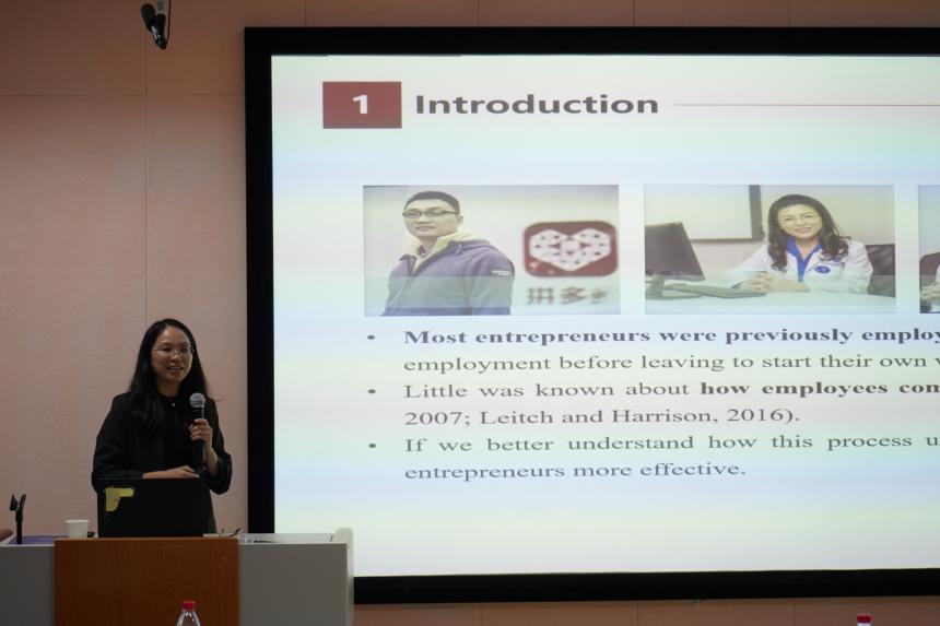taptap点点体育助理研究员刘莎莎做了《创业者身份同化过程:身份游戏机制》,探讨了员工如何自愿成为创业者,构建了创业者身份同化的过程模型,并说明了其中可能自我的动态推拉平衡作用以及身份游戏的迭代机制,打开了身份过程理论的同化黑箱。