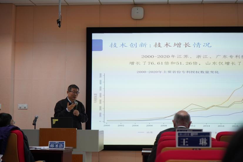 南京大学经济学院院长,商学院副院长郑江淮做了《城市技术邻近性与区域创新集群发展--山东现象与长三角、广州对比分析》,介绍了新旧动能转换与高质量发展背景下,全国各省创新驱动发展格局。对比了山东与长三角、广东省高技术产业的发展及区域研发投入状况,及各省内部技术邻近性变化。深度剖析了山东与其他省份、主要城市之间的技术邻近性变化。