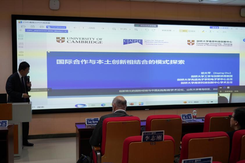 英国剑桥大学先进光子学与电子技术中心(CAPE)主席、山东大学讲习教授初大平做了《国际合作与本土创新相结合的模式探索》,介绍了剑桥大学与剑桥的科研创新,剑桥创新生态系统的强大网络和剑桥的创新生态圈。指出国际合作与本土创新相结合的新模式,要发挥国际顶级资源优势,结合本土战略发展方向,以应用创新为出发点,加速原创成果的产业化进程。