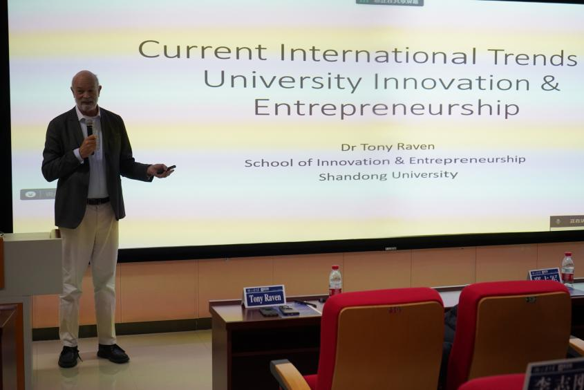 剑桥大学剑桥企业中心前首席执行官、山东大学特聘教授AnthonyRaven做了《高校创新创业的国际化趋势》,从国家的经济政策、高校创新活动的资助、激励研究人员建立衍生公司三个方面进行了介绍。