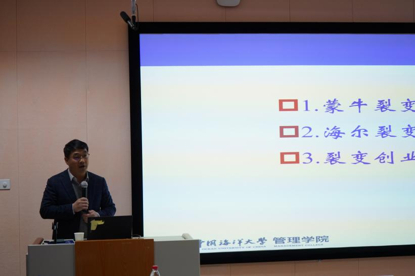 中国海洋大学教授李志刚做了《中国企业裂变式发展的相关问题探讨》,以蒙牛、海尔两家具有显著裂变创业特征的企业为例,详细讲解了“中国企业裂变式发展”的研究成果,提出大企业与小企业交互关系需要从裂变式发展视角重新审视,通过裂变式发展,大中小企业可实现协同共生、融通创新的创新观点。