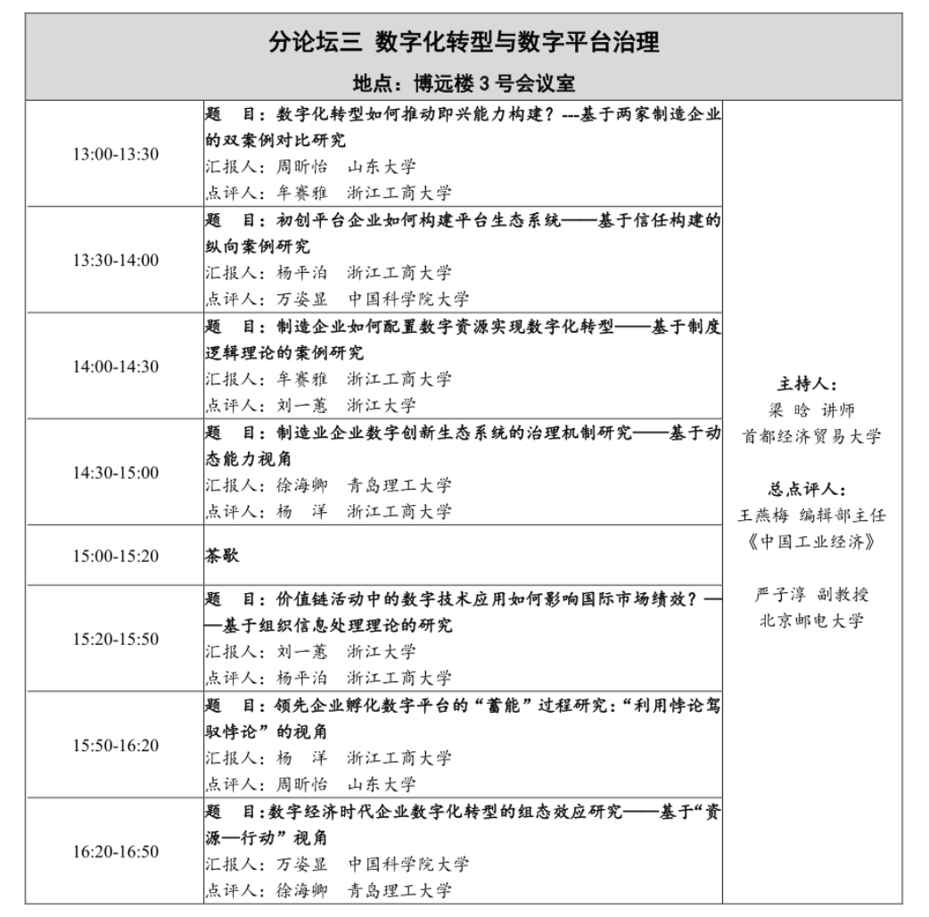 2023年11月24日,由首都经济贸易大学主办、首都经济贸易大学工商管理学院和会计学院共同承办的第五届“中国青年管理学者论坛•工商管理论坛”于首都经济贸易大学举办,论坛以“中国式现代化背景下的企业可持续发展”为主题,号召青年管理学者立足新发展阶段、新发展理念和新发展格局,结合中国的工商管理实践,重点关注绿色转型与可持续发展、数字化转型、企业创新等研究前沿,剖析中国工商管理问题,讲好中国工商管理故事。我院副研究员王琳团队应邀作为论文汇报者全程参与此次学术研讨。