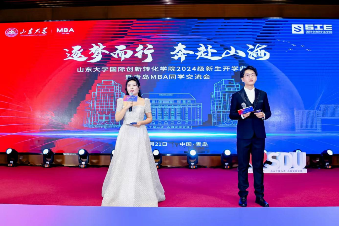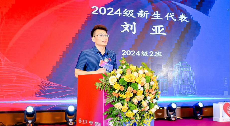 山东大学MBA2024级新生代表刘亚发言。他对2024级新生的未来充满信心,作为山大的一份子,2024级新生也会将历届山大人的精神传承发扬。作为此次活动的总导演,他展示了新时代青年的精神风貌与责任担当。作为MBA2024级2班的班长,刘亚深感责任重大。班长是班级活动的牵头人和领导者,期待所有班委成员团结合作,为班级融合、品牌打造贡献出了自己的力量。