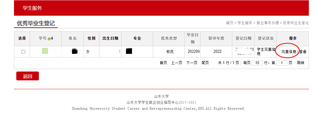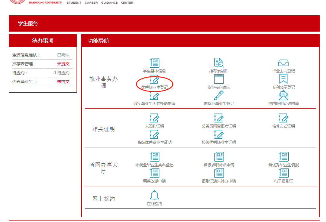 学生登录“山东大学就业管理服务系统”后,进入“就业事务”-“优秀毕业生登记”,查看并完善登记表相关息,填写无误后提交至学院审核。