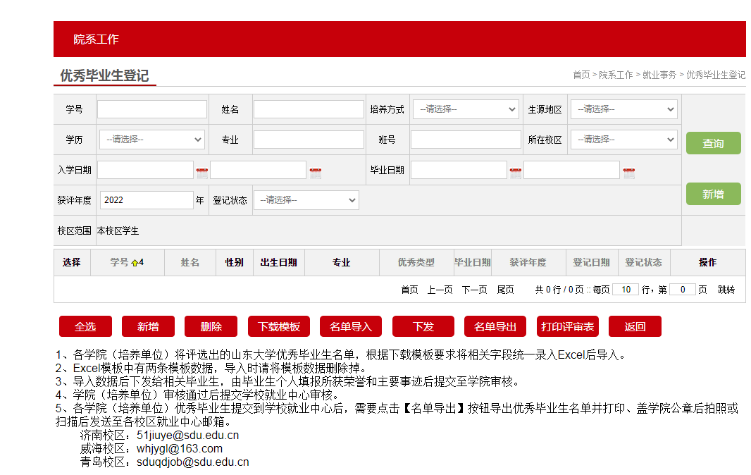 (1)各学院(培养单位)登录“山东大学就业管理服务系统”后,进入“就业事务”-“优秀毕业生登记”,将初选名单根据系统模板要求导入。