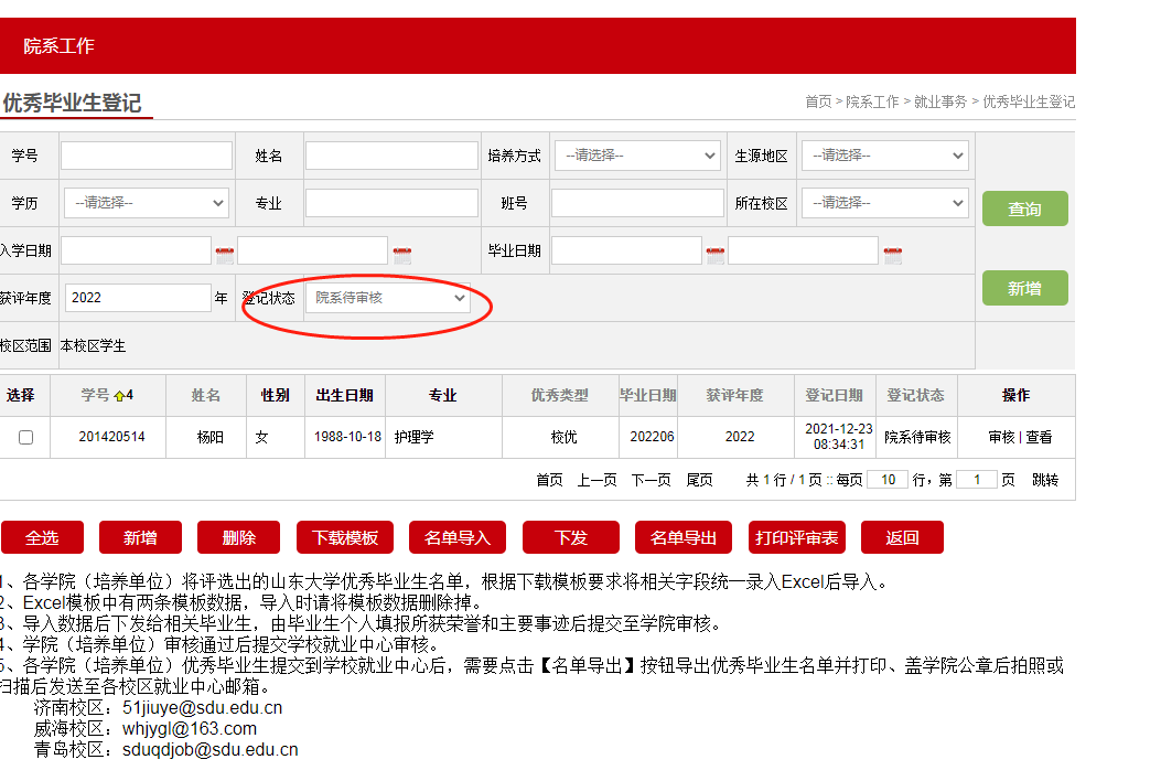 各学院(培养单位)请于12月20日前完成院系审核,并将山东大学优秀毕业生汇总名单、学生在校期间成绩单及学院公示情况扫描后打包发送至相关邮箱(济南校区:51jiuye@sdu.edu.cn,威海校区:whjygl@163.com,青岛校区:sduqdjob@sdu.edu.cn)。