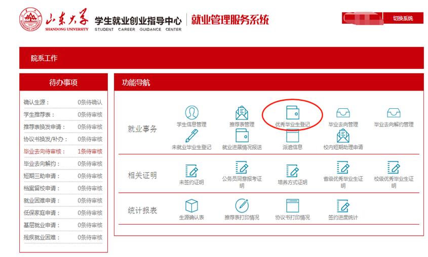 1.各学院(培养单位)登录“山东大学就业管理服务系统”后,进入“就业事务”-“优秀毕业生登记”,将初选名单根据系统模板要求导入。