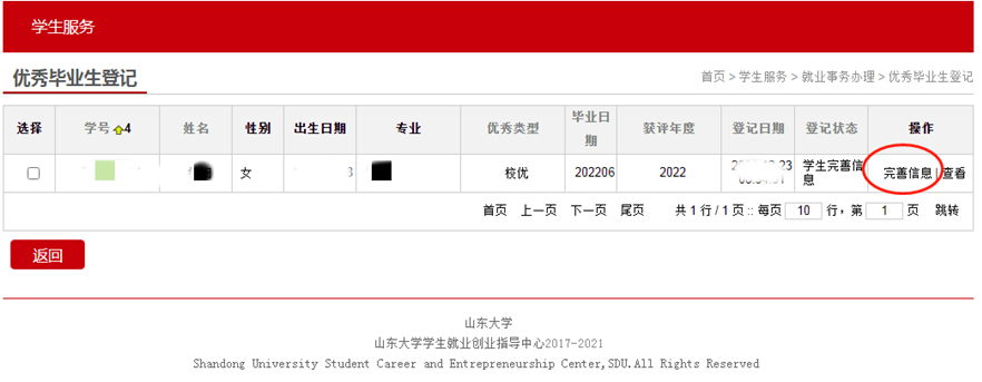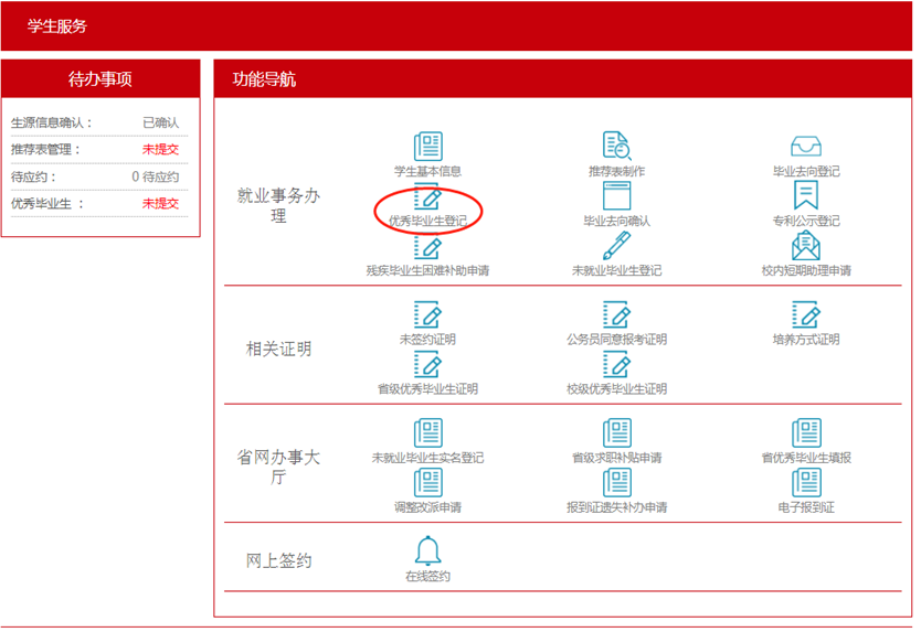 学生登录“山东大学就业管理服务系统”后,进入“就业事务”-“优秀毕业生登记”,查看并完善登记表相关息,填写无误后提交至学院审核。