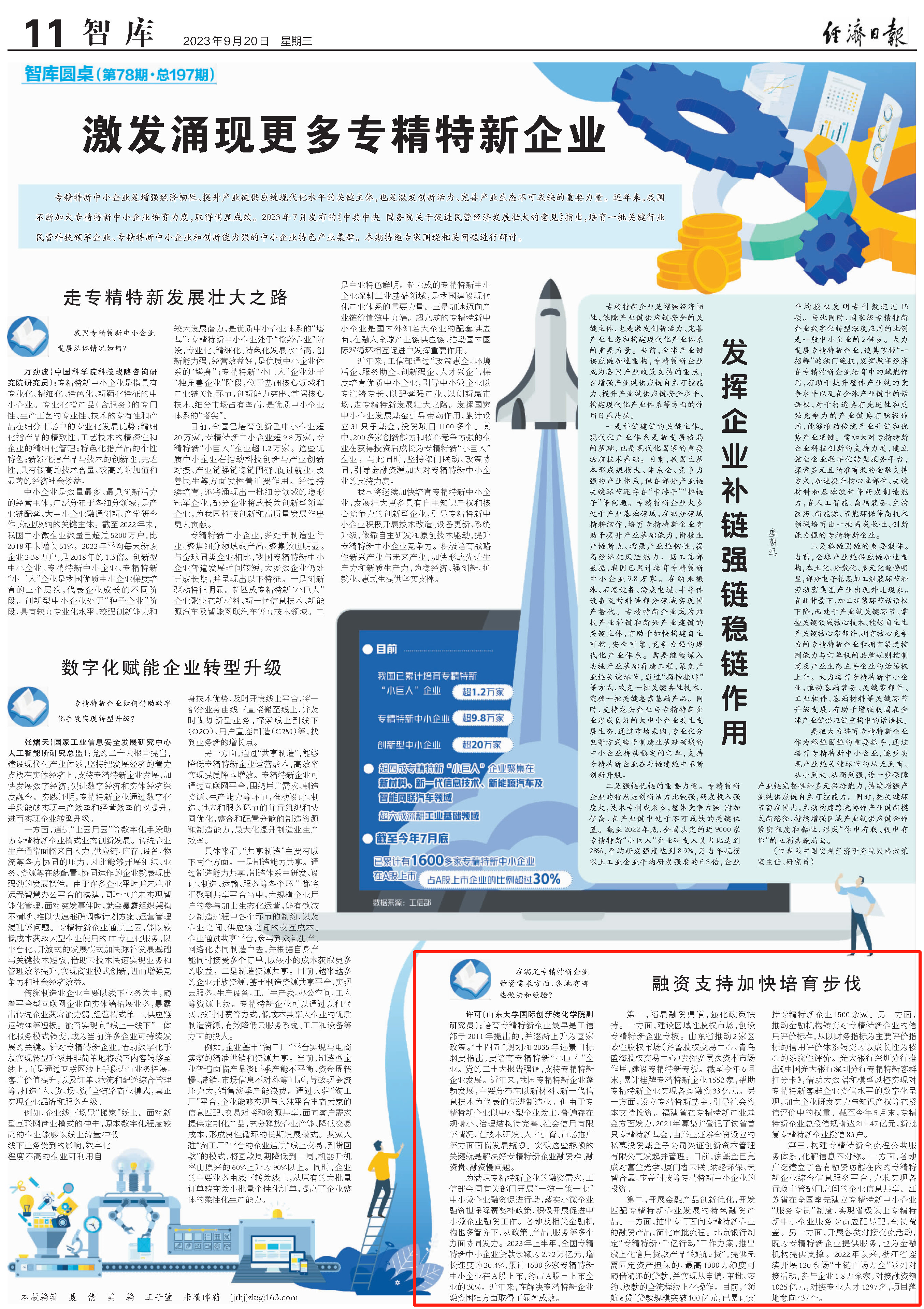 9月20日,taptap点点体育副研究员许可在《经济日报》第11版“智库”板块刊发署名文章《融资支持加快培育步伐》,主要梳理介绍了在专精特新企业融资方面各地的做法和经验。
